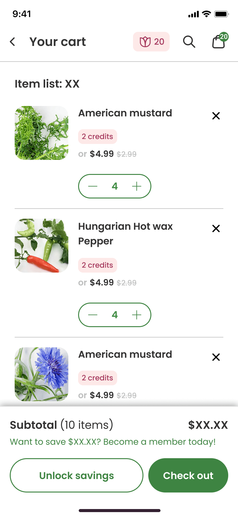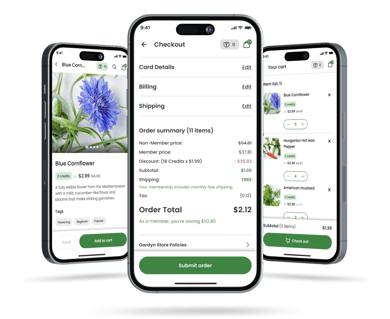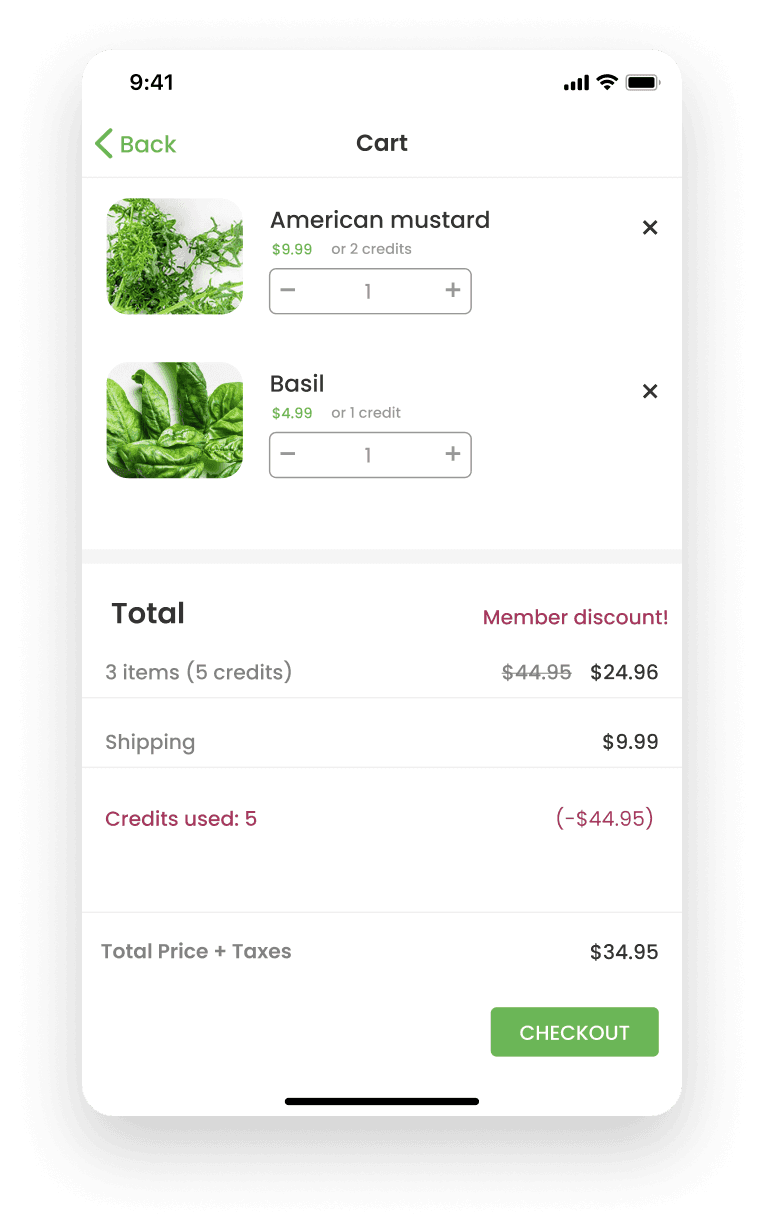Gardyn's shop posed an interesting challenge in that users have the option to use a combination of credits and dollars for their plant purchases. Members receive credits as part of their membership, while non-members make purchases using dollars.